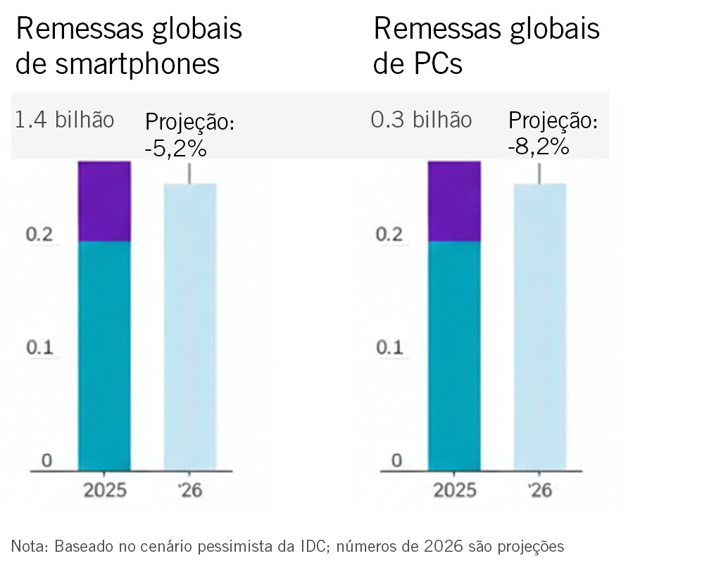 A Dell elevou em até 30% os preços de alguns notebooks corporativos. PCs de entrada da Acer passaram a oferecer menos memória multitarefa. A chinesa Xiaomi descontinuou a versão com menor capacidade de memória de seu novo aparelho intermediário e aumentou preços. A LG Electronics já revisou para baixo sua projeção de vendas de TVs em 2026.