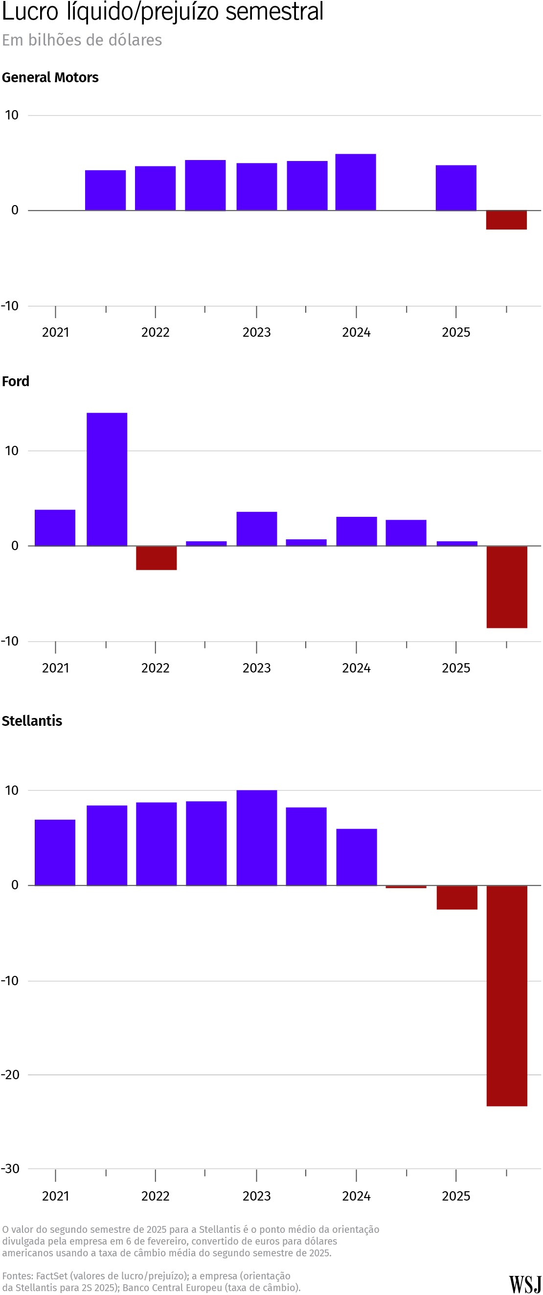 Após anos de investimentos em tecnologia em veículos elétricos, as “Três Grandes” de Detroit — General Motors, Ford Motor e a fabricante do Jeep, Stellantis — anunciaram mais de US$ 50 bilhões em baixas contábeis combinadas.
